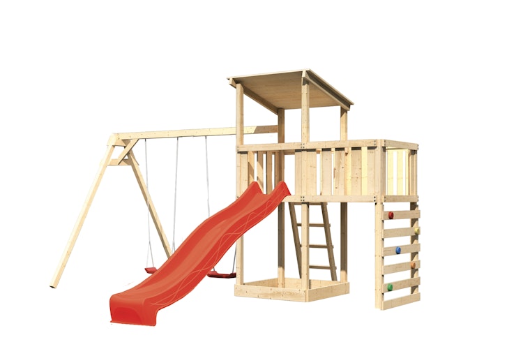 - Bei diesem Set ist ein Doppelschaukelanbau, eine Anbauplattform, eine Wellenrutsche in Wunschfarbe und eine Kletterwand inklusive.