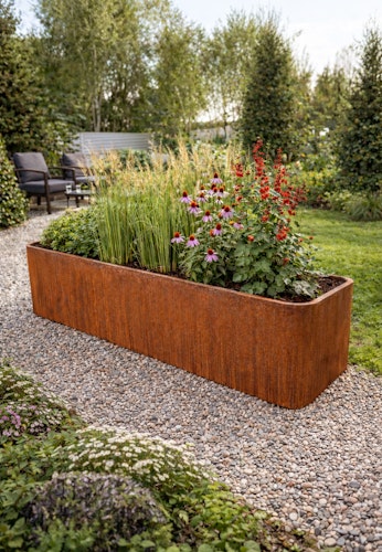 Die Badeko Edelrost Pflanzeinfassung „Riva 1800“ besticht durch ihr modernes, klares Design und setzt stilvolle Akzente in jeder Gartenanlage. Mit ihrer großzügigen Breite von 180 cm bietet sie vielseitige Möglichkeiten zur individuellen Bepflanzung. Die stabil verschweißten Innenstreben sorgen für hohe Standfestigkeit.