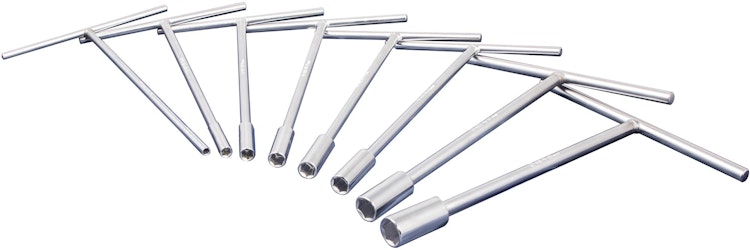 Der 8-teilige T-Griff Schraubendrehersatz zeichnet sich durch Außensechskant, starre Ausführung, und hochglanzverchromtes, durchgehend gehärtetes Material aus. Größen: SW 6, 8, 10, 12, 13, 14, 17, 19 mm.