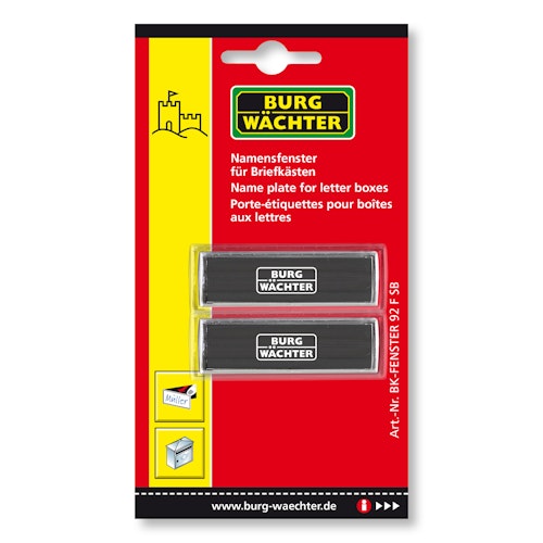 Das BURG-WÄCHTER Namensfenster BK 92 F ist passend für die meisten BURG-WÄCHTER Briefkästen. Das Kunststoff-Fenster hat ein Maß von 74 x 22 mm. Sie erhalten 2 Ersatz-Namensfenster auf einer SB-Karte.