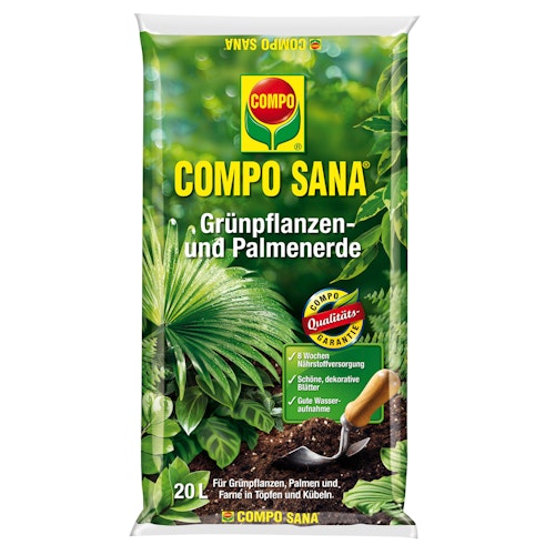 Die sofort anwendbare, hochwertige COMPO SANA Grünpflanzen- und Palmenerde ist auf die besonderen Eigenschaften aller immergrünen Zimmer- und Balkonpflanzen, Palmen und Farne bestens abgestimmt und fördert ein kräftiges, vitales Wachstum der dekorativen Blätter sowie die Entwicklung eines satten Grüns. Aufgrund Ihrer bereits enthaltene Start-Düngung wird die pflanzenschonende, langsame und gleichmäßige Freisetzung aller wichtigen Haupt- und Spurennährstoffe garantiert. Eine zusätzliche Nachdüngung ist deshalb erst nach ca. 8 Wochen nötig. Angesichts seiner auserlesernen Inhaltsstoffe, wie z.B. der Wurzel-Aktivator AGROSIL und der PERLITE Atmungsflocken aus natürlichem Vulkangestein, erhält diese Grünpflanzen- und Palmenerde eine lockere und luftige Struktur. Die optimale Wasser- und Nährstoffversorgung der Pflanzen ist gewährleistet. Mittels eines speziell für die Pflanzenbedürfnisse eingestellten pH-Werts wird die optimale Nährstoff-Ausnutzung durch die Wurzeln ermöglicht. Nicht geeignet ist diese Blumenerde für Moorbeetpflanzen, Aussaaten und Orchideen da diese einen besonders niedrigen pH-Wert erfordern.