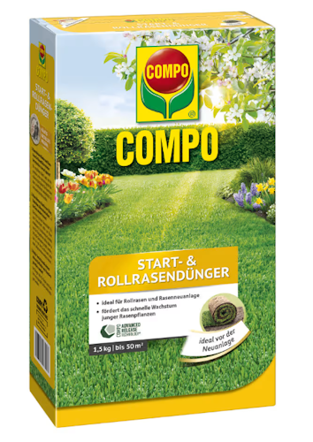 Der COMPO Start- & Rollrasendünger unterstützt das sichere Anwachsen junger Rasenpflanzen – ideal bei Rollrasenverlegung, Nachsaat oder Neuanlage. Die optimal auf die jungen Rasenpflanzen abgestimmte Nährstoffkombination fördert die Wurzelbildung, Keimung und sorgt für einen dichten, strapazierfähigen Rasen. Insbesondere wenn Ihr Rasen über den Winter beschädigt wurde, eignet sich der COMPO Start- und Rollrasendünger bestens zur Bodenvorbereitung.
