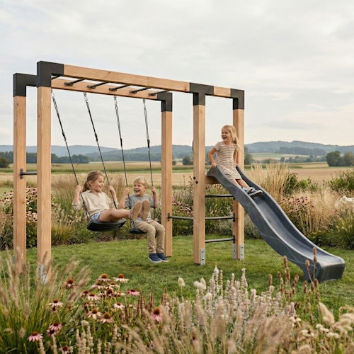 Die EXIT Linea Robust 110 Holz-Monkeybar mit Doppelschaukel, Rutsche und Reckstange ist eine kompakte Spielkombination aus Douglasienholz, die Klettern, Schaukeln, Seilschaukeln und Rutschen in einem stabilen Gestell vereint. Dank robuster Holzbalken, verzinkter Stahlmonkeybar, anthrazitfarbiger Schaukelsitze und einer Rutsche bietet sie vielseitigen Spielspaß für Kinder und eine einfache Montage im Garten. Das hochwertige Holz aus europäischen Wäldern ist langlebig, pflegeleicht und das Gerät vollständig reparier- sowie recycelbar.