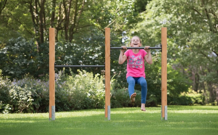 Die EXIT Linea Robust 110 Doppel-Reckstange aus robustem Douglasienholz bietet mit zwei 125 cm breiten Reckstangen auf fast drei Metern Breite reichlich Platz für spielerisches Training und gemeinsame Übungen. Das langlebige, witterungsbeständige Gestell ist einfach zu montieren, 100 % reparierbar und nahezu vollständig recycelbar.