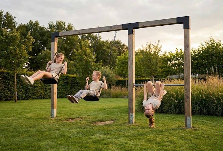 Die EXIT Linea Robust 110 Doppelschaukel mit Reckstange verbindet Schaukeln und Turnen in einem stabilen Spielgerät für den Garten. An dem bis zu drei Kinder gleichzeitig aktiv sein können. Das robuste Holzgestell aus hochwertigem Douglasienholz, die extra breite Reckstange und die grauen Schaukelsitze sorgen für langanhaltenden Spielspaß, hohe Stabilität und eine moderne Optik.