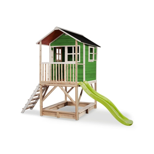 Jedes Kind findet es toll, sein eigenes "kleines Häuschen" zu haben! Ein Spielgerät zum Spielen und Entdecken. Das EXIT Loft 500 ist mit seinem natürlichen Aussehen ein tolles Häuschen! Dieses lustige Spielhäuschen ist zu Recht der Traum jedes Kindes ab 3 Jahre. Das Haus steht auf Ständern und enthält eine Veranda und Rutsche.