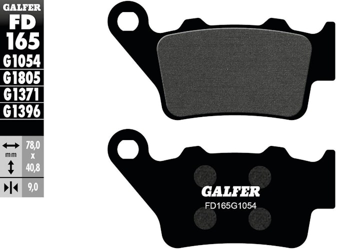 Hochwertiger GALFER Bremsbelagsatz FD165 in der Mischung G1054. Gefertigt aus Stahl für maximale Sicherheit, die ECE-R-90-Normen übertrifft.