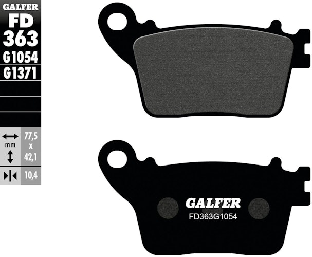 Hochwertiger GALFER Bremsbelagsatz FD363 in der organischen Standardmischung G1054. Gefertigt aus Stahl für maximale Sicherheit, die ECE-R-90-Normen übertrifft.