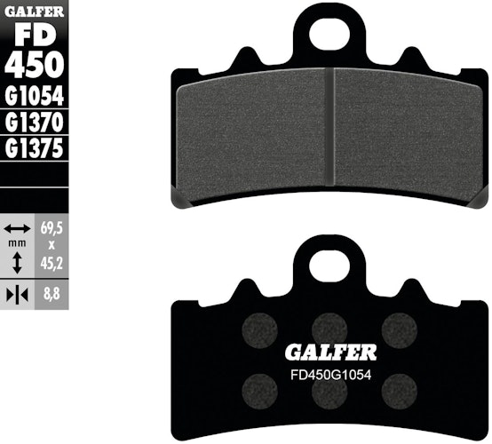 Hochwertiger GALFER Bremsbelagsatz FD450 in der Mischung G1054. Gefertigt aus Stahl für maximale Sicherheit, die ECE-R-90-Normen übertrifft.