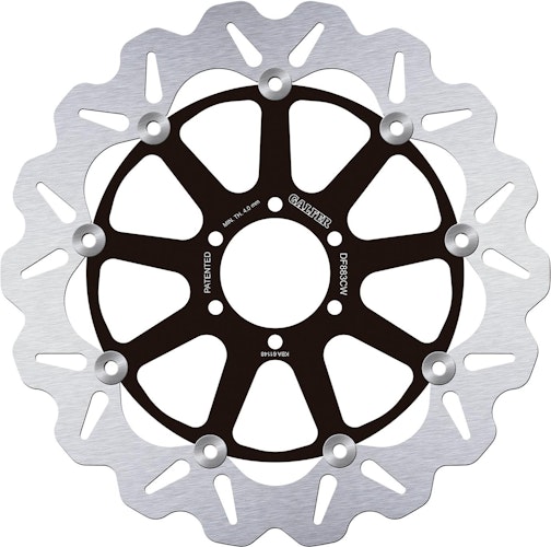 Zertifizierte GALFER DF883 Wave-Bremsscheibe. Schwimmende Bauweise aus Stahl und Aluminium mit R90R-Zulassung für höchste Standfestigkeit und Sicherheit.