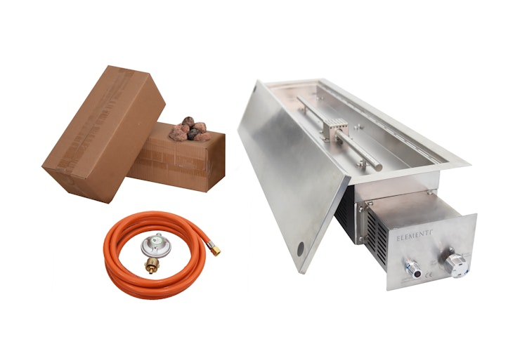 Einbau Gasbrenner, rechteckig, inkl. Zündvorrichtung, Gasleitung, Druckminderer, Abdeckplatte aus Edelstahl und Lavastein Füllung, für Propan Gas