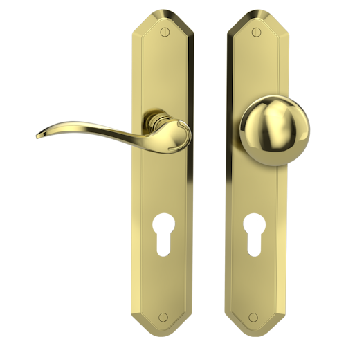 Griffwerk AMADEUS -Messing Optik Langschild-Garnitur -sichtbar verschraubt -Knopf R21 -WL -TS 40-45mm