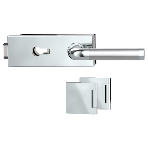 Griffwerk Glastürbeschlag PURISTO S mit Griff SIMONA PROF Profilzylinder Flüster 3-tlg. Bänder SIMONA Edelstahl poliert