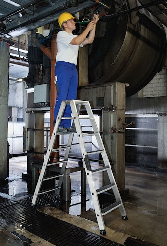 Die Leiter verfügt über 80 mm tiefe Stufen mit zertifizierter, rutschhemmender clip-step R13 Trittauflage für den Einsatz in nassen und öligen Arbeitsbereichen, dauerhafter Stufen- / Holmverbindung, rutschsicherer nivello®-Leiterschuher und ergo-pad® Griffzone mit Klemmmechanismus.