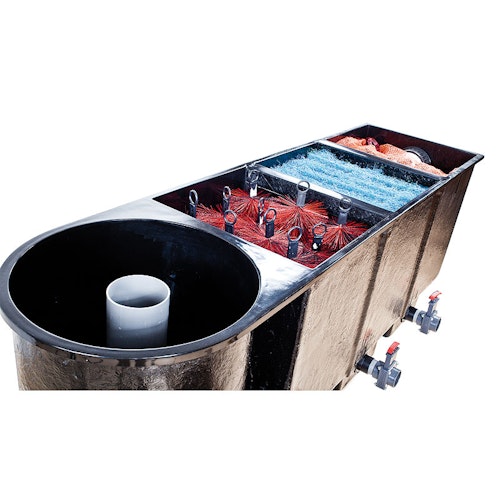 GFK- Durchlauffilter mit hochwertiger Ausstattung zur Wasserfilterung über eine Vortex-Absetzkammer sowie eine mechanische und zwei biologische Filterungen. Jede Kammer verfügt über einen separaten Schmutzauslass.
