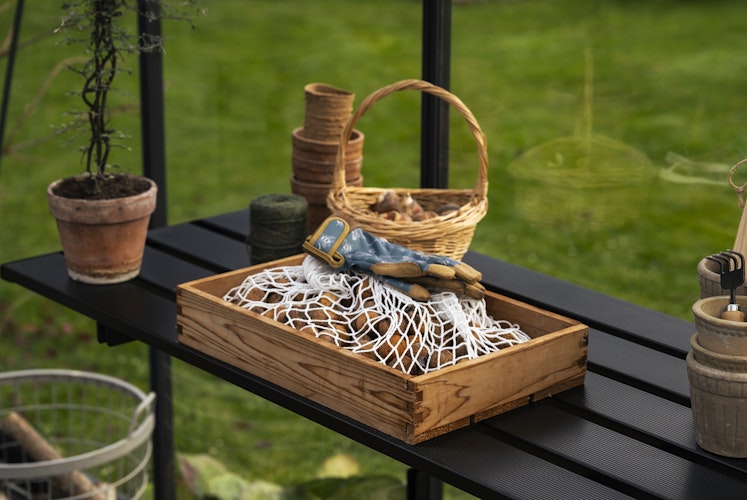 Der Lamellentisch bietet eine großzügige Arbeitsfläche für Anzuchtschalen, Töpfe und Werkzeuge, montiert direkt im Gewächshaus. Bei Platzbedarf klappbar, fügt sich das moderne Design harmonisch ein und fördert die Luftzirkulation, ideal auch zur Wandmontage.
