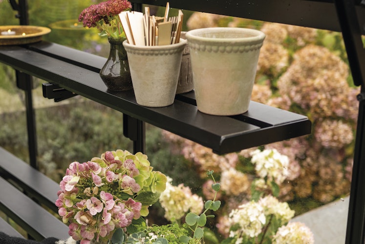 Das klappbare Lamellenregal wird direkt in die Profile des Halls ICON Gewächshauses eingesetzt und schafft eine stabile Ablage für Pflanzen, Töpfe und Zubehör. Wachsen Tomaten & Co. in die Höhe, lässt sich das Regal einfach herunterklappen und gibt sofort wertvollen Platz frei. Das pulverbeschichtete Aluminium ist langlebig, pflegeleicht und sorgt dank Lamellen für eine gute Luftzirkulation.