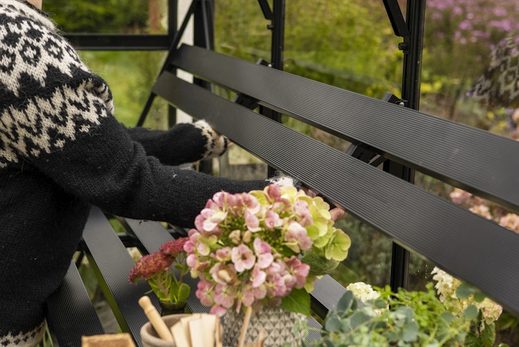 Das klappbare Lamellenregal passt ideal in die Profile des Halls QUBE 6 und bietet eine stabile Ablage für Pflanzen, Töpfe und Gartengeräte. Wenn Tomaten & Co. in die Höhe wachsen, lässt sich das Regal einfach herunterklappen und schafft sofort zusätzlichen Platz. Die schwarz pulverbeschichteten Aluminium-Lamellen sind langlebig, pflegeleicht und fördern eine gute Luftzirkulation.