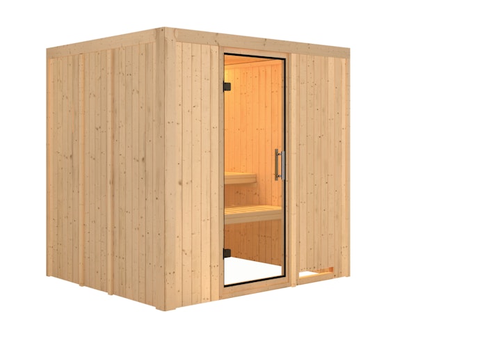 Karibu Sauna Sodin mit Fronteinstieg inkl. Saunatür, Ofenschutzgitter, Kopfstütze und Espenholzbänken. Lieferung je nach Wunsch ohne Ofen oder mit einem 9 kW Ofen mit integrierter Steuerung, einem 9 kW Ofen mit externer Steuerung oder einem 9 kW Bio-Kombiofen mit externer Steuerung.