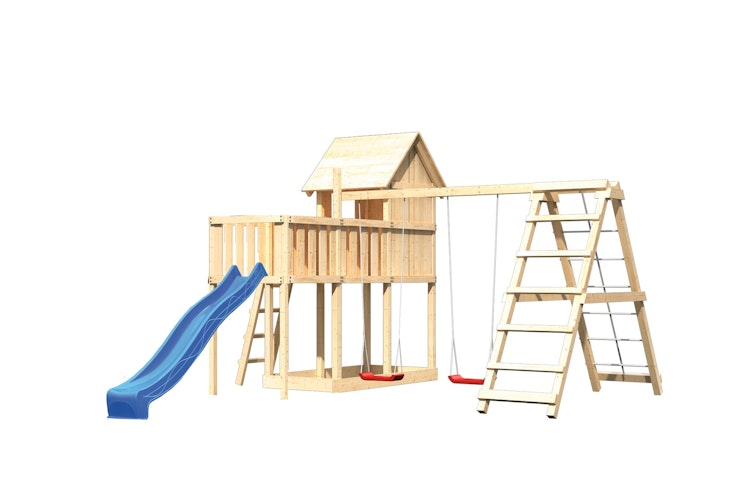 Karibu Akubi Stelzenhaus Frieda mit Wellenrutsche, Doppelschaukelanbau, Klettergerüst und Anbauplattform