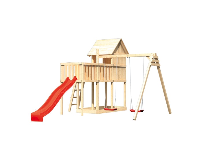 Karibu Akubi Stelzenhaus Frieda mit Wellenrutsche, Doppelschaukelanbau und Anbauplattform