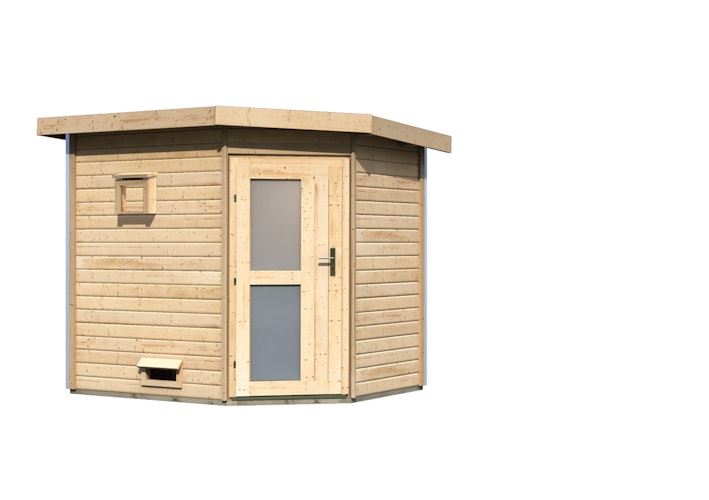 Karibu Gartensauna Pultdach Saunahaus Mikka mit Eckeinstieg naturbelassen inkl. gratis 9 kW Bio-Saunaofen im Wert von 879,99 €