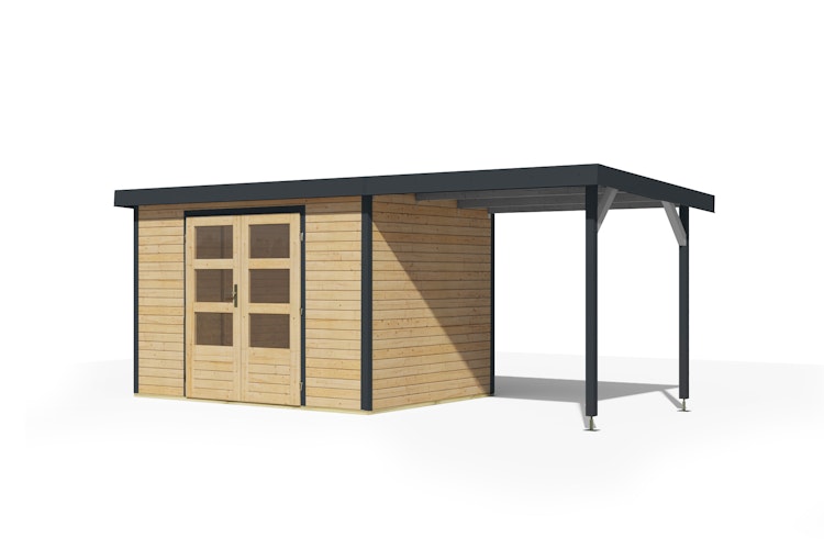 - Das Anbaudach ist optional erhältlich: Zusätzlicher Stauraum und erweiterte Nutzungsmöglichkeiten als Gartenlounge