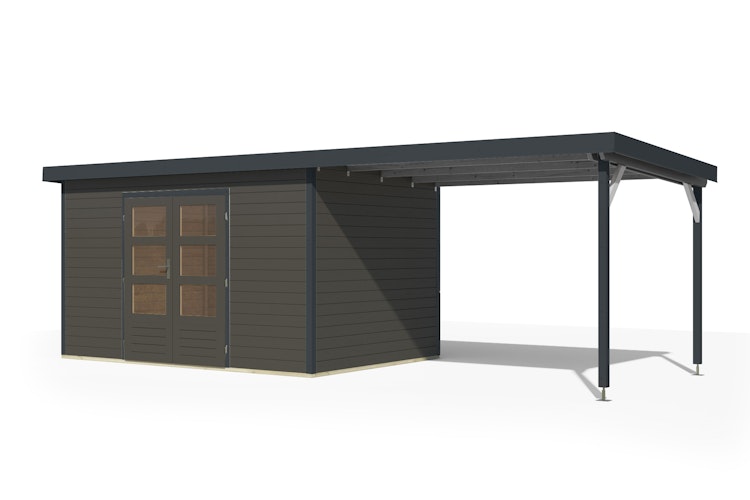 - Das Anbaudach ist optional erhältlich: Zusätzlicher Stauraum und erweiterte Nutzungsmöglichkeiten als Gartenlounge