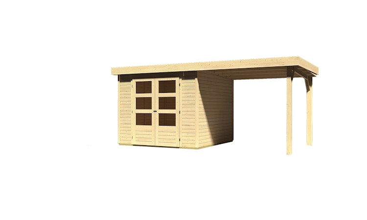 Mit dem Karibu/Woodfeeling Gartenhaus Askola liegen Sie voll im Trend. Das 16 mm Pultdach und die Doppelflügeltür runden das moderne Design perfekt ab. Bei diesem Set ist ein 225 cm breites Schleppdach (240 cm Dachstand) inklusive, das an beiden Seiten des Hauses montiert werden kann.