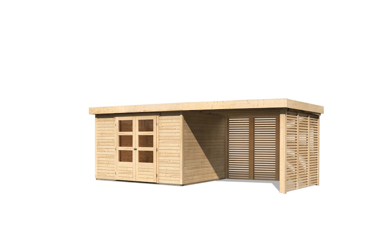 Mit dem Karibu/Woodfeeling Gartenhaus Askola liegen Sie voll im Trend. Das 16 mm Pultdach und die Doppelflügeltür runden das moderne Design perfekt ab. Bei diesem Set ist ein 275 cm (Dachstand 280 cm) breites Schleppdach mit Rück- und Seitenwand in Lamellenoptik inklusive, welches an beiden Seiten des Hauses montiert werden kann. Die Lamellenwände eignen sich beispielsweise ideal zur Brennholzlagerung.