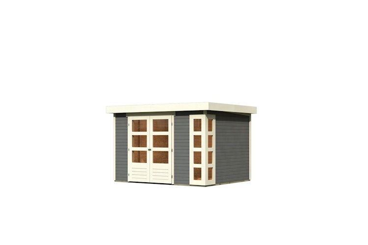 19 mm Karibu Woodfeeling Gartenhaus Kerko mit Flachdach und Doppeltür, erhältlich in drei Größen und zwei Farb-Ausführungen. Dieses besondere Haus bietet dank der Eck-Fenster einen besonders hellen Innenraum.