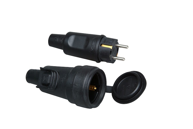 IP44, 16A, 250V, Schuko-Vollgummistecker und -Gummikupplung mit Steckerverriegelung, Spritzwasserschutzkappe,bruchfest, schlagfest, Kabelquerschnitt bis 3x2,5mm², schwarz