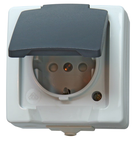 1-fach, mit Deckel, mit erhöhtem Berührungsschutz/ Kindersicherung, Aufputz-Feuchtraum, 16A, 250 V~grau