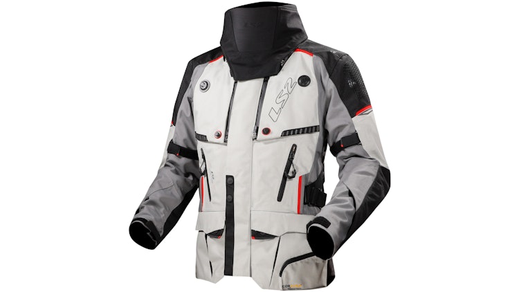 LS2 Apollo Tourenjacke für Herren in Grau / Schwarz / Rot (Gr. XXL): Dreilagiges laminiertes CORDURA®-Gewebe mit 21.000 mm-Membran und 16.077 g/m²/24 h Atmungsaktivität, herausnehmbares Thermofutter, abnehmbarer Halskragen, Ventilationsöffnungen an Brust & Rücken, verstellbar im Taillen- & Armbereich, Daumenschlaufen, 2 wasserdichte Außentaschen + 1 Rückentasche. CE-Protektoren an Schultern & Ellbogen (Level 2), vorbereitet für Brustprotektoren, reflektierende Details.