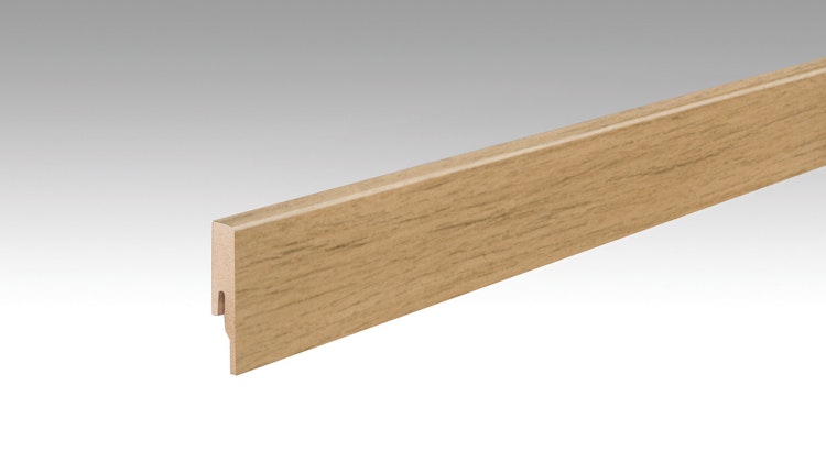 Die MEISTER Fußleiste Profil 20 PK Chapman Stick - 2380 mm besitzt eine hellbraune Holzoptik und sorgt für einen sauberen Übergang zwischen Boden und Wand. Ideal für die Meister Designböden.