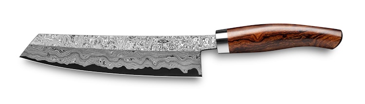 Hohe Konzentration, über viele Stunden oder gar Tage, erfordert das Herausarbeiten der Schneidlage aus feinstem Kohlenstoffstahl, die schwarz unter wildem Damast zu erkennen ist - eine handwerkliche Meisterleistung, die nur wenige Schmiede auf der Welt in Vollendung beherrschen.