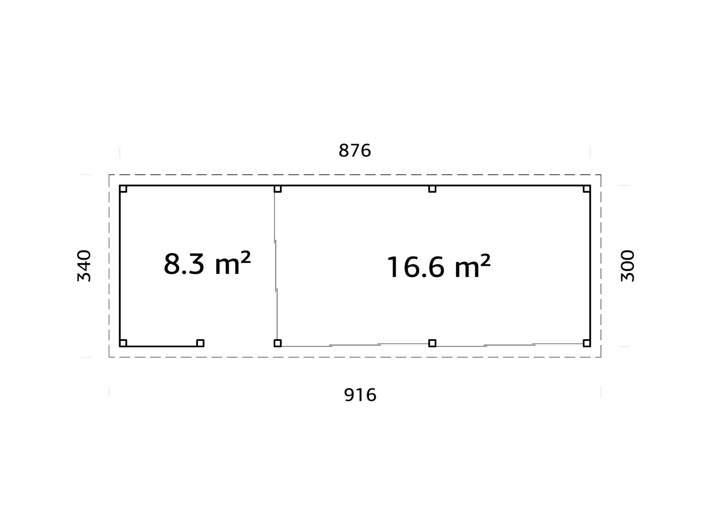 | Außenmaße (BxT) | 916 x 340 cm |