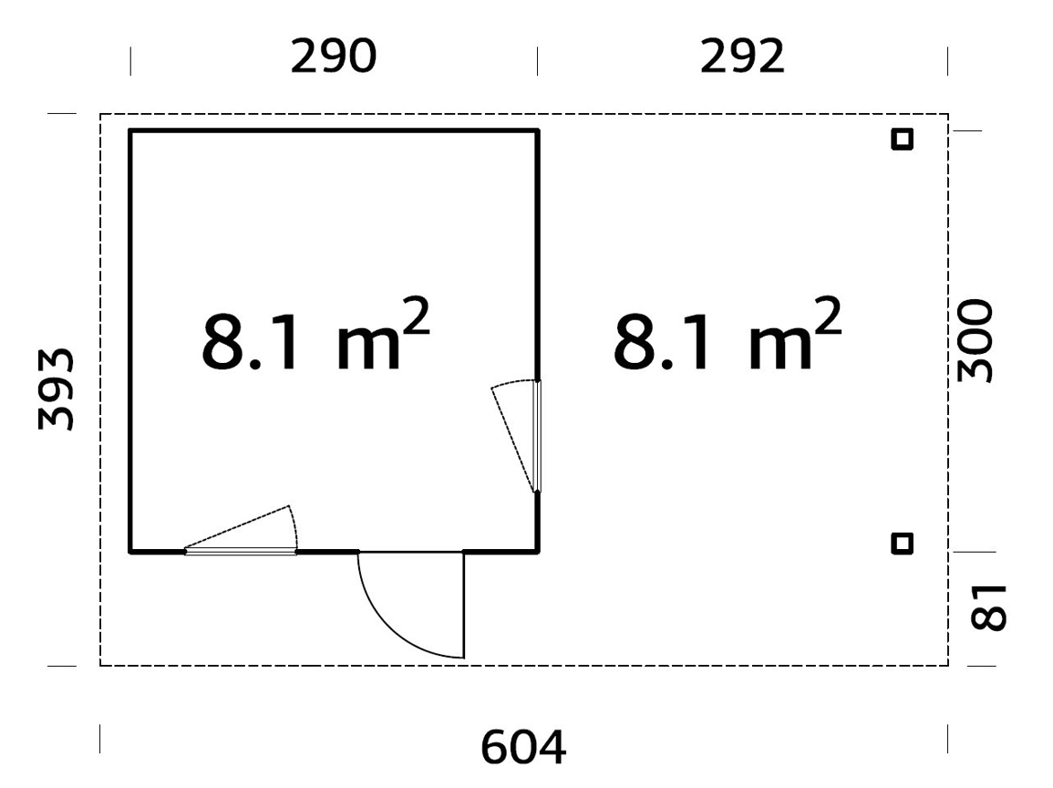Wandaußenmaße (BxTxH): 582 (290 + 292 cm Anbau) x 300 x 258 cm