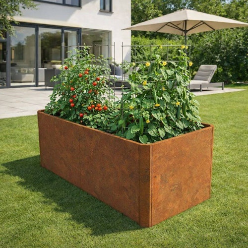 Das Premium-Hochbeet aus Cortenstahl verleiht deinem Garten eine stilvolle Note und kombiniert durchdachtes Design mit praktischer Funktionalität. Die natürliche Rostpatina und die komfortable Arbeitshöhe von 75 cm ermöglichen rückenschonendes Gärtnern im Stehen. Die robuste Konstruktion aus 2 mm dickem Stahl sorgt für Langlebigkeit und Stabilität, während unsichtbare Verschraubungen für ein modernes, klares Design sorgen.