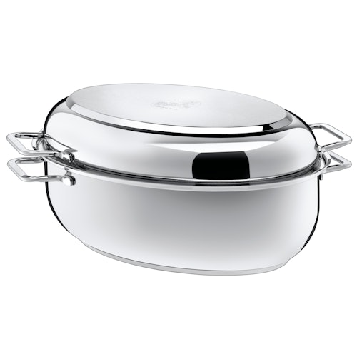 Gefertigt aus besonders hochwertigem, strapazierfähigem, rostfreiem, pflegeleichtem und spülmaschinengeeignetem Edelstahl 18/10 überzeugt der multifunktional einsetzbare, vielseitige Extrabräter mit Metalldeckel von Silit beim Braten, Garen und Schmoren auf jedem Herd und auch im Backofen. Dabei ist er einerseits als großer Bräter einsetzbar, in dem mühelos ganze Familienportionen aus großvolumigen Gemüse, Geflügel oder Braten Platz finden. Und andererseits dient der Metalldeckel auch einfach als Servierpfanne zur Zubereitung der unterschiedlichsten Pfannengerichte und schließlich zum stilvollen Servieren bei Tisch. Bräter und Deckel verfügen dazu über einen energiesparenden Silitherm®-Allerdboden, der mit optimaler Wärmeverteilung und -speicherung und begeistert.