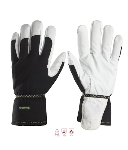 Warmer und geschmeidiger Handschuh, der das am meisten exponierte Körperteil vor Flammen und Lichtbogen schützt, wenn unter kalten Bedingungen gearbeitet wird. Der Handschuh besteht aus geschmeidigem Ziegenleder und hat ein flammhemmendes Thinsulate-Futter.