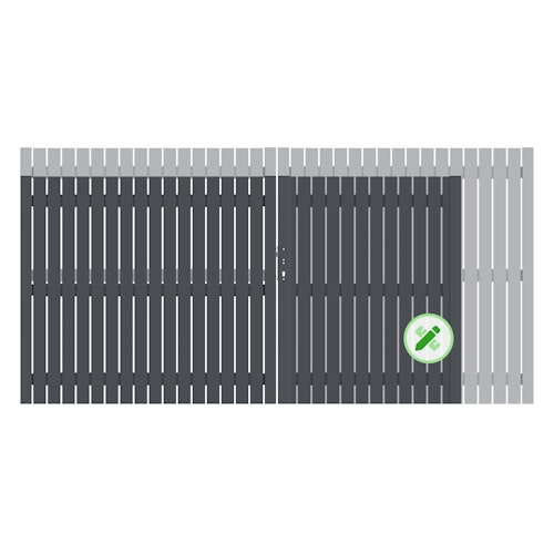 Das TraumGarten Alu-Doppeltor Squadra auf Maß mit E-Antrieb. Ihr Wunschtor wird inklusive Einsteckschloss, Beschlagsatz, Bodenschieber, Aufhebelschutz und Auflaufstütze geliefert.