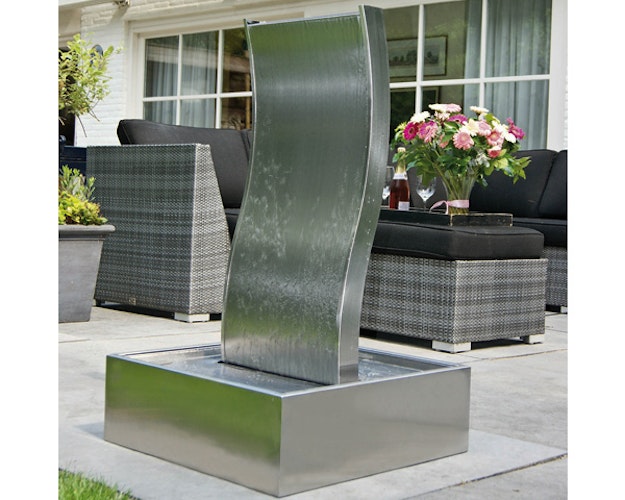 Das Wasserspiel Genova von Ubbink ist ein modernes und exklusives Wasserspiel aus gebürstetem Edelstahl in eleganter Wellenform. Das fließende Wasser erzeugt faszinierende Lichteffekte und macht Genova zu einem stilvollen Highlight – im Garten, auf der Terrasse oder im Innenbereich.