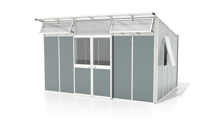 Doch auch die praktischen Eigenschaften des Hauses sind nicht zu verachten. Durch die UV-stabilen HKP wird das Licht gebrochen, sodass keine direkte Sonneneinstrahlung ins Haus kommt. Die leichtgängigen Schiebetüren sind durch ein Zylinderschloss abschließbar. Regenfallrohre und eine Regenrinne ermöglichen das Sammeln von wertvollem Regenwasser. Durch die Höhe von 1,87 bis 2,42 Meter in allen Varianten ist ein problemloses Stehen im gesamten Haus möglich.