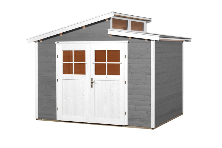 Farbiger Akzent für Ihren Garten: Weka 21 mm Gartenhaus 226 mit versetztem Satteldach, Oberlichtern und praktischer Doppeltür. Das Gartenhaus ist Teil der vielfältigen Weka Blackmount Serie.