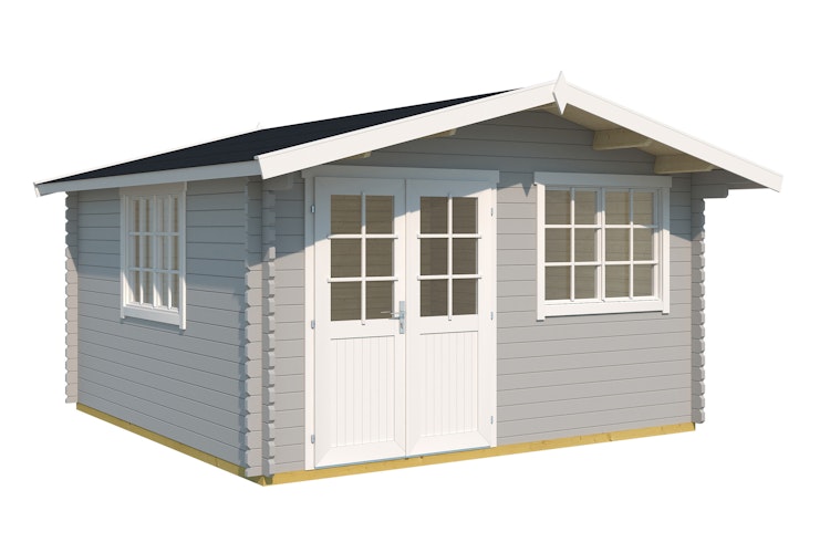 Satteldach Gartenhaus 401 in stabiler Blockbohlenbauweise, 40 mm Wandstärke, mit 18 mm Massivholzdach und Massivholzboden, 2 extra großen Dreh-/Kippfenstern und Doppeltür. Optional mit farblicher Behandlung ab Werk in hellgrau erhältlich. Das Gartenhaus ist Teil der vielfältigen Weka Livigno Serie.