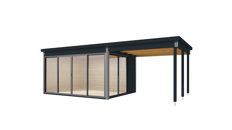 Das exklusive Wolff Finnhaus Gartenhaus Studio 44-D mit Seitendach verbindet die Natürlichkeit von Holz mit modernen Alu-Designelementen. Die Eckverkleidungen und der Rahmen der hochwertigen Schiebetür sind in anthrazitfarbenem Aluminium gehalten. Für einen bequemen Zugang lässt sich die Schiebetür beidseitig öffnen. Das 3 m lange Seitendach bietet genug Platz für Möbel und Accessoires, wodurch sie sich ihren Garten zu einem kleinen Paradies einrichten können.