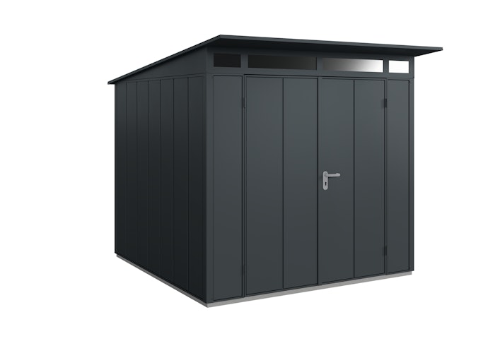Das Wolff Finnhaus Metallgerätehaus Fascinato 2424 kommt mit moderner Pultdach Optik mit Oberlichtern für einen angenehm hellen Innenraum. Optional kann das Haus mit Einzel- oder Doppeltüre bestellt werden, beide Türen kommen mit sehr hoher Durchgangshöhe (194 cm). Die Lieferung erfolgt inkl. Aluminium-Bodenrahmen, Türfeststeller mit Gasdruckfeder, Regenfallrohr und Edelstahl-Drückergarnitur